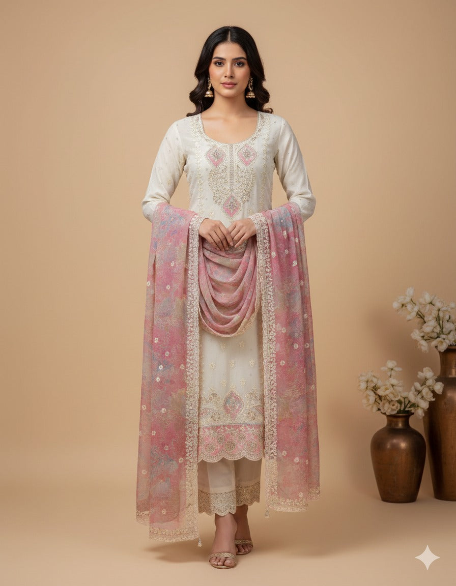 Step into festive elegance with this stunning Rose Gold Suit Set, designed to give you a rich, graceful, and glamorous look.