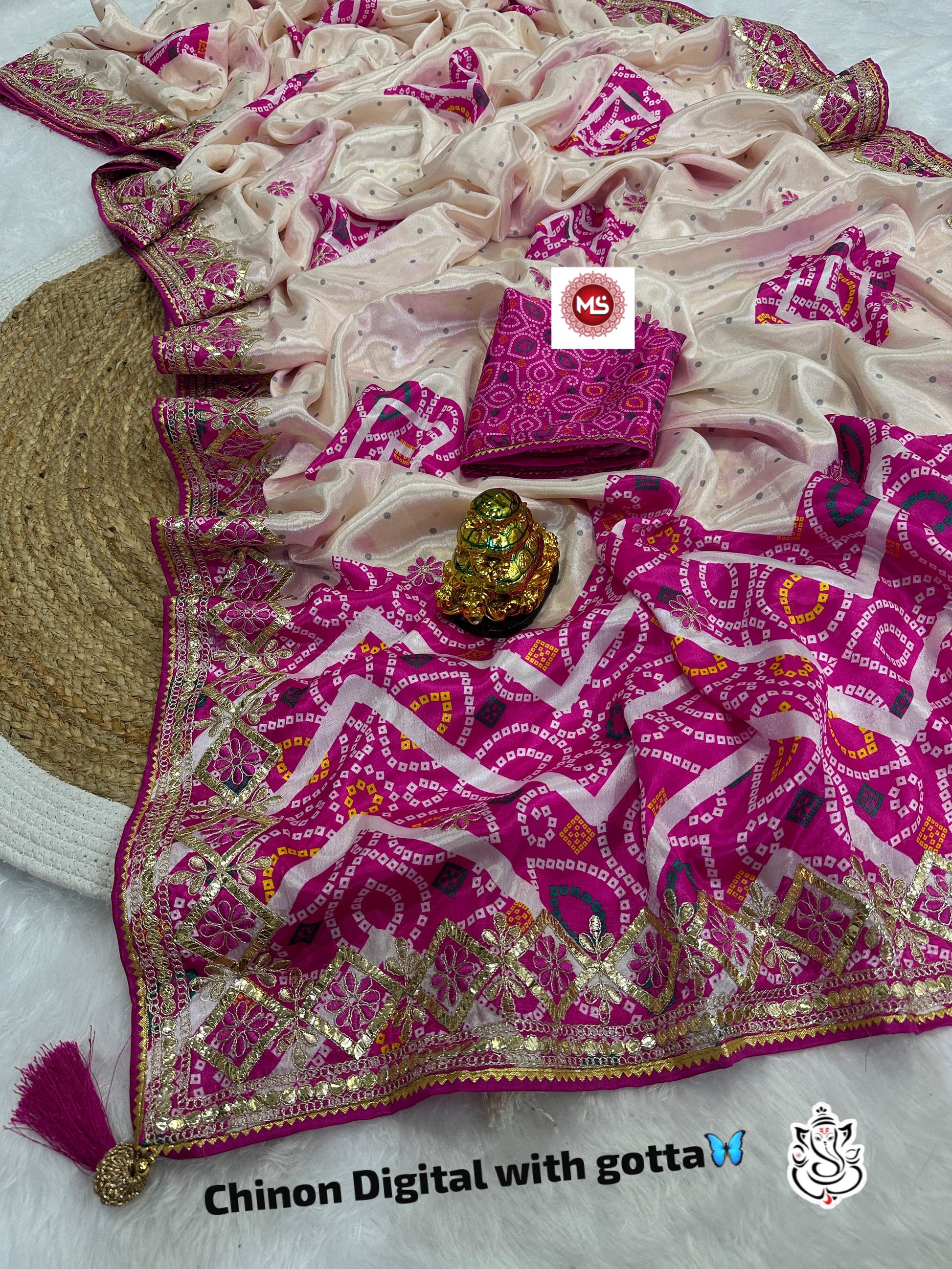Fabric nd detail :- heavy Digital Chinon silk bandhej saree with beautiful c-pallu with thred and gottpati work in all saree with multi nd coding work with rich look samosa piping and heavy latkan on pallu thats give you a rich look👌