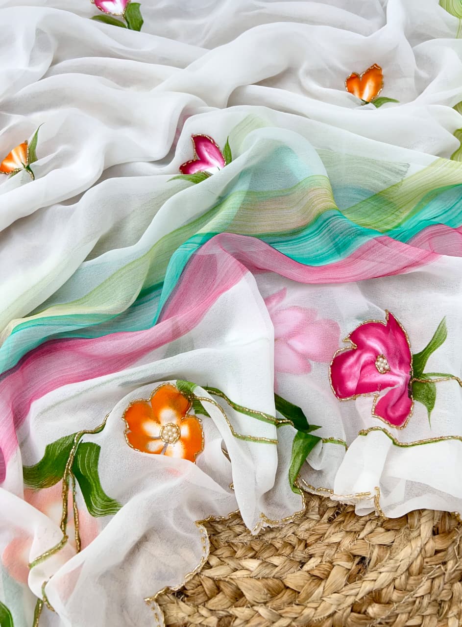 Luxury Handmade Georgette Saree with All-Over Floral Handwork