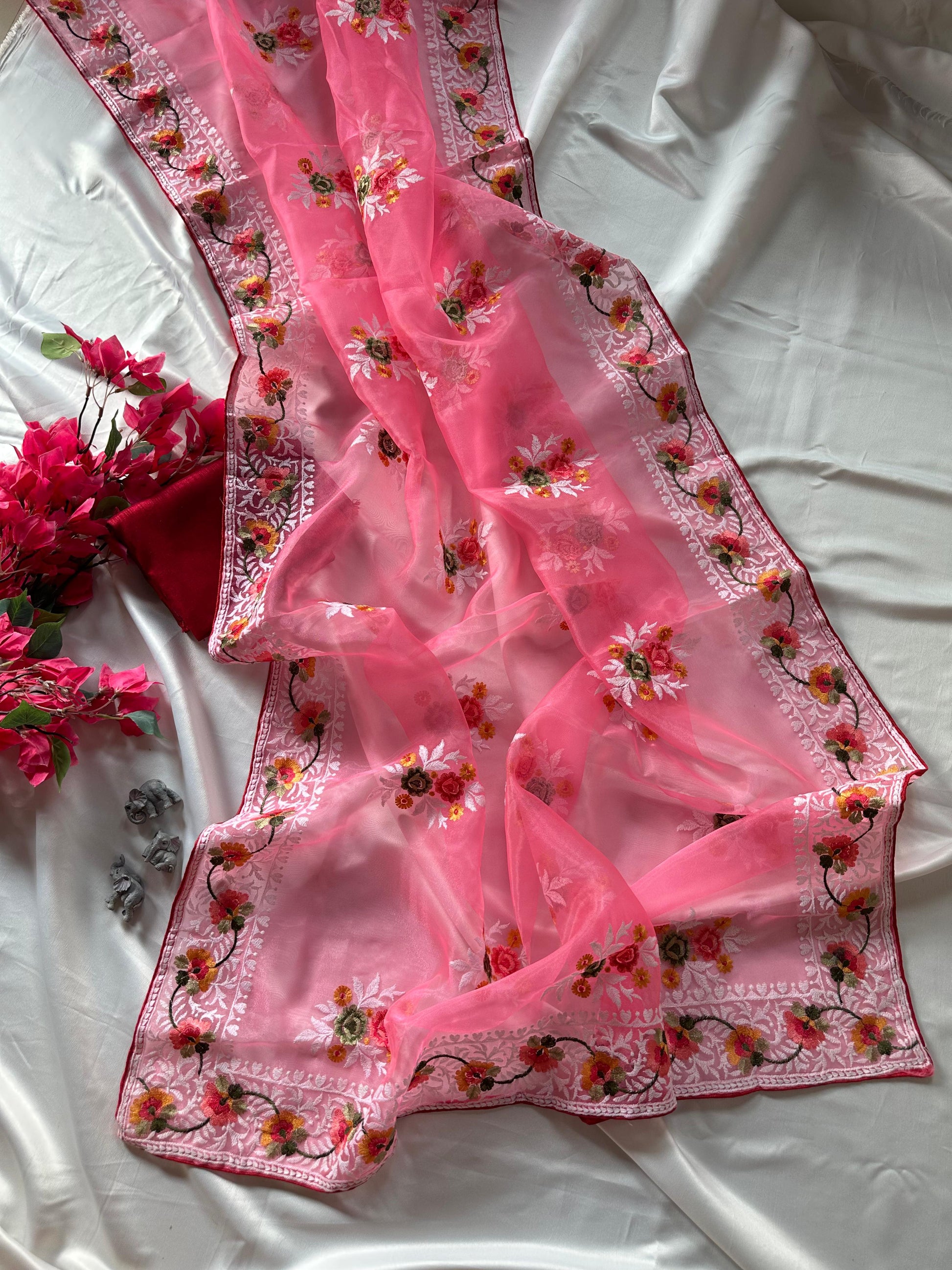Premium Refined Organza Silk Saree with Viscose Thread Embroidery & Raw Silk Blouse