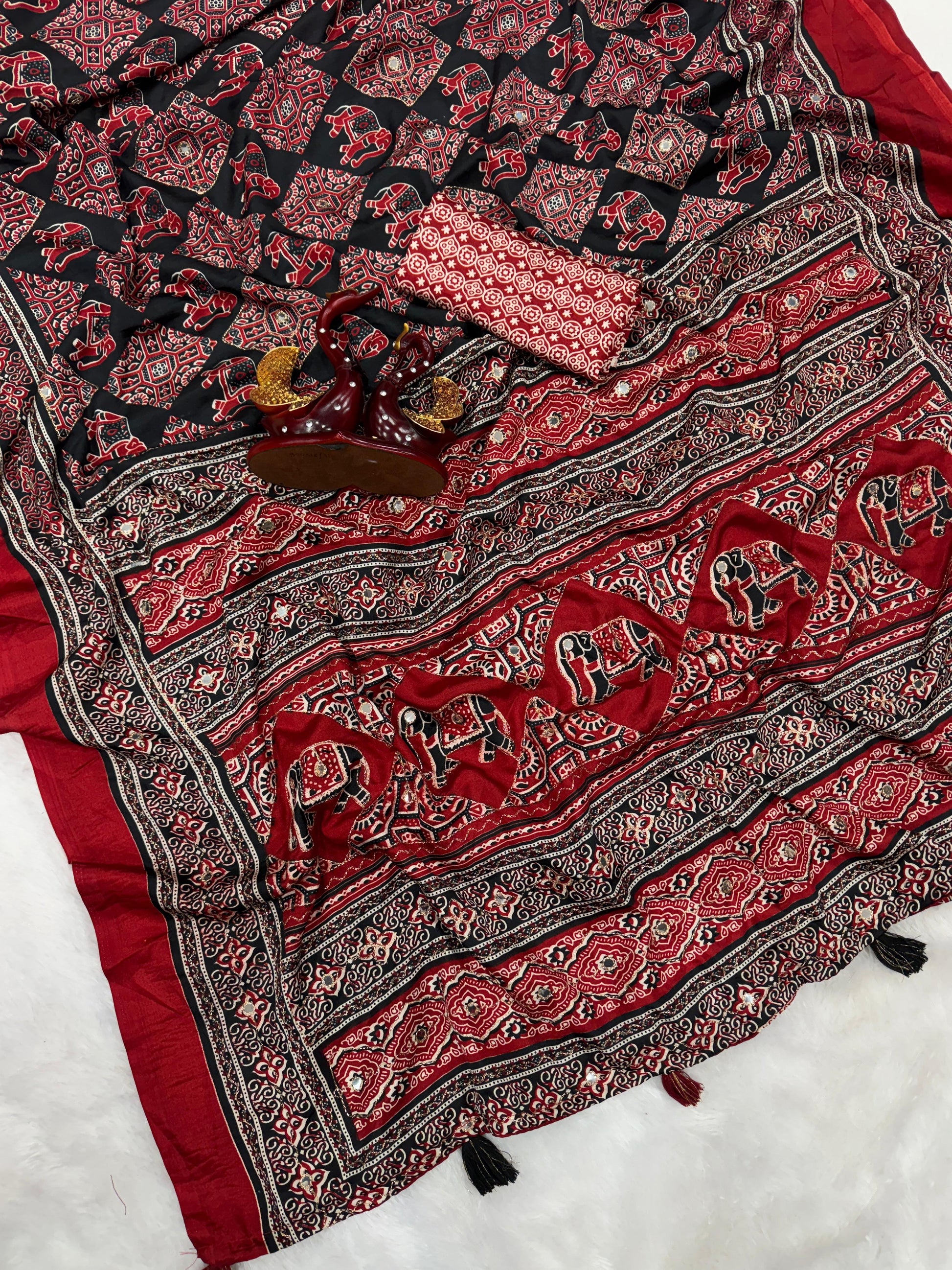 Premium Soft Crepe Silk Saree with Ajrakh Print, Zari & Mirror Work