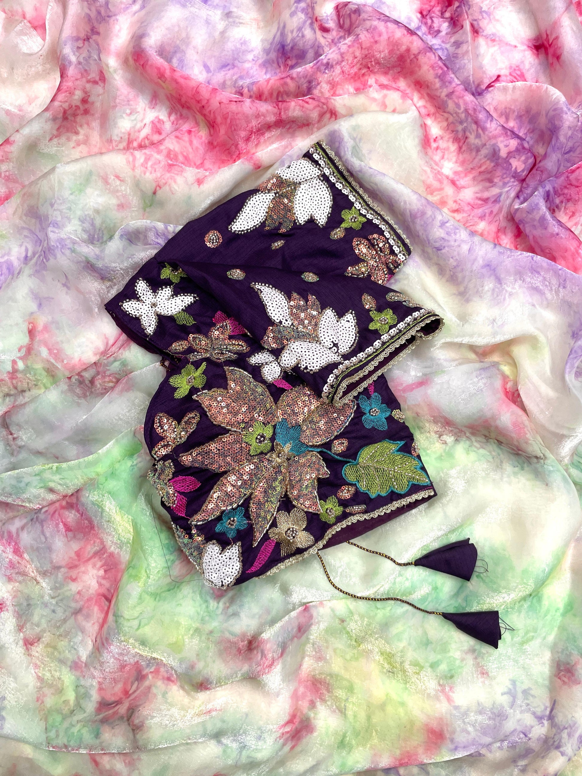 Comes with a Jalpari blouse adorned with beautiful Brits work, adding a touch of glamour and sophistication. (Unstitched blouse fabric)