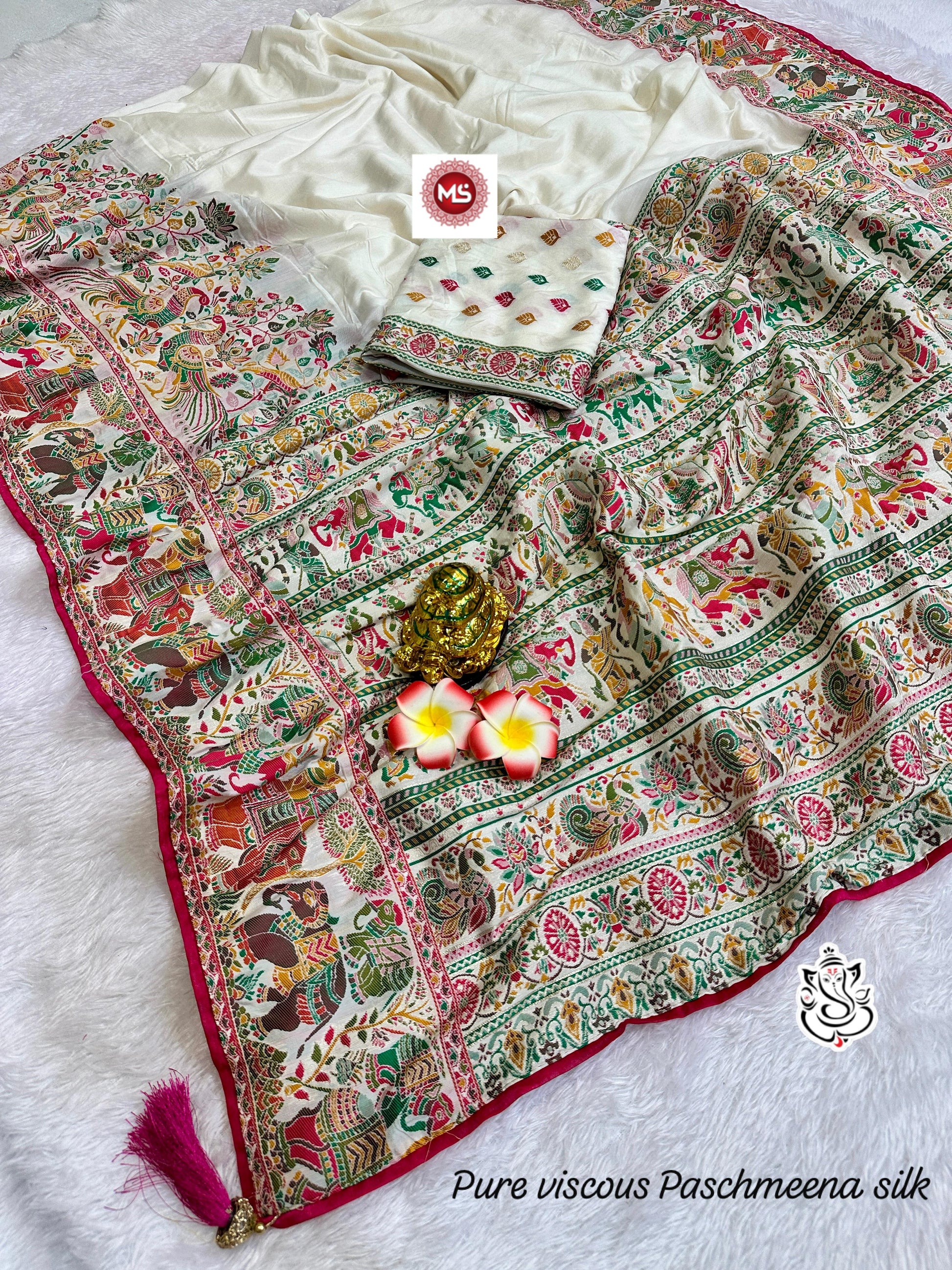 Fabric & details :- viscose Paschmeena silk saree with hand dying with Meenakari rich look heavy pallu & samosa border with 2 fancy tussle